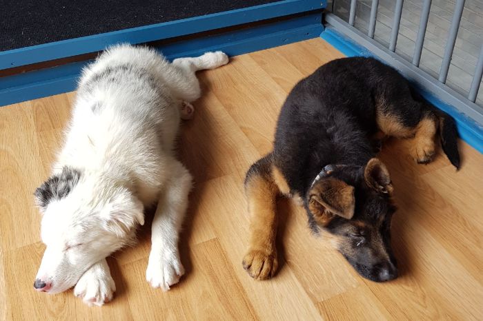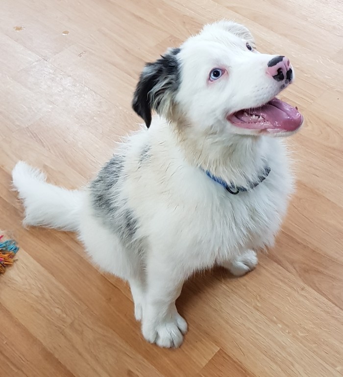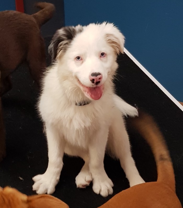 Jasper is a delightful young Border Collie puppy. Jasper is a Blue Merle and deaf, but this doesn’t make any difference in day care! Jasper is a very smart boy, he watches and follows the other pups and we’re learning a bit of sign language so he understands us too. Jasper is our Laughing Dog of the Day!