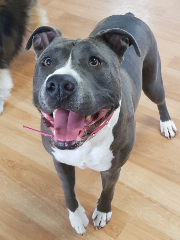 Jordy is a terrific American Staffy bursting with energy and lots of fun. Jordy loves ball games and tug o war. Jordy is our Laughing Dog of the Day!