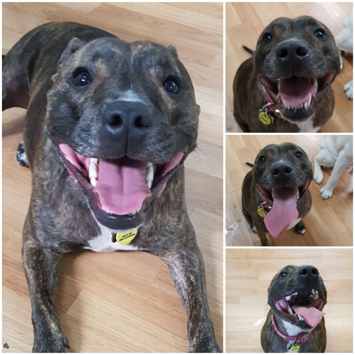 Izzy is a fun loving English Staffordshire Terrier who just wants to have fun! Izzy loves chasing the ball and playtime with friends. Izzy is our Laughing Dog of the Day!