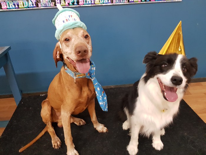 It was party time today, with the Laughing Dog Duncan Hungarian Vizsla and Indie Border Collie celebrating their birthdays – Duncan’s 7th and Indie’s 4th! Party Hats, pupcakes, music and bubbles made for the perfect celebration! Happy Birthday Duncan and Indie!